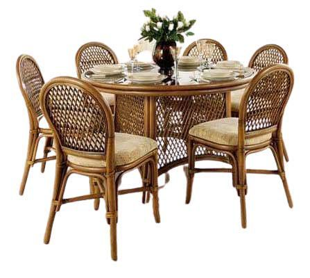 Premium dining table with six matching rattan chairs and cushioned seats.
