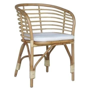 Curved barrel-style rattan chair with cushion, ideal for indoor and outdoor use.