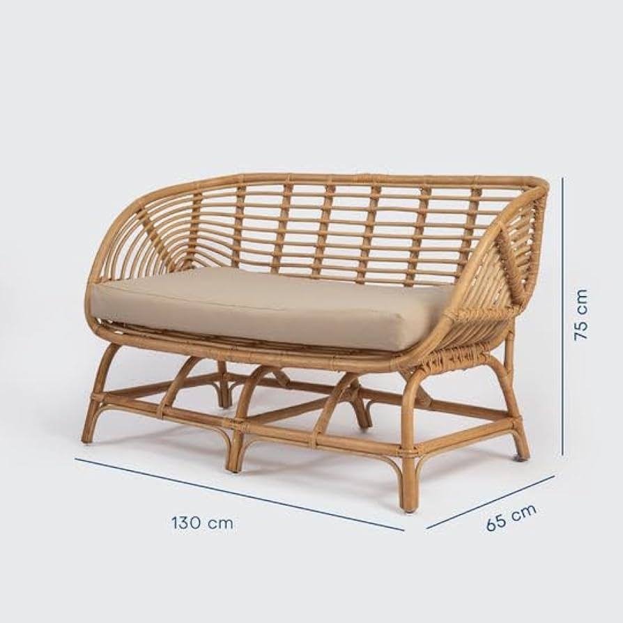 Small two-seater rattan sofa with cushioned seat and curved frame.