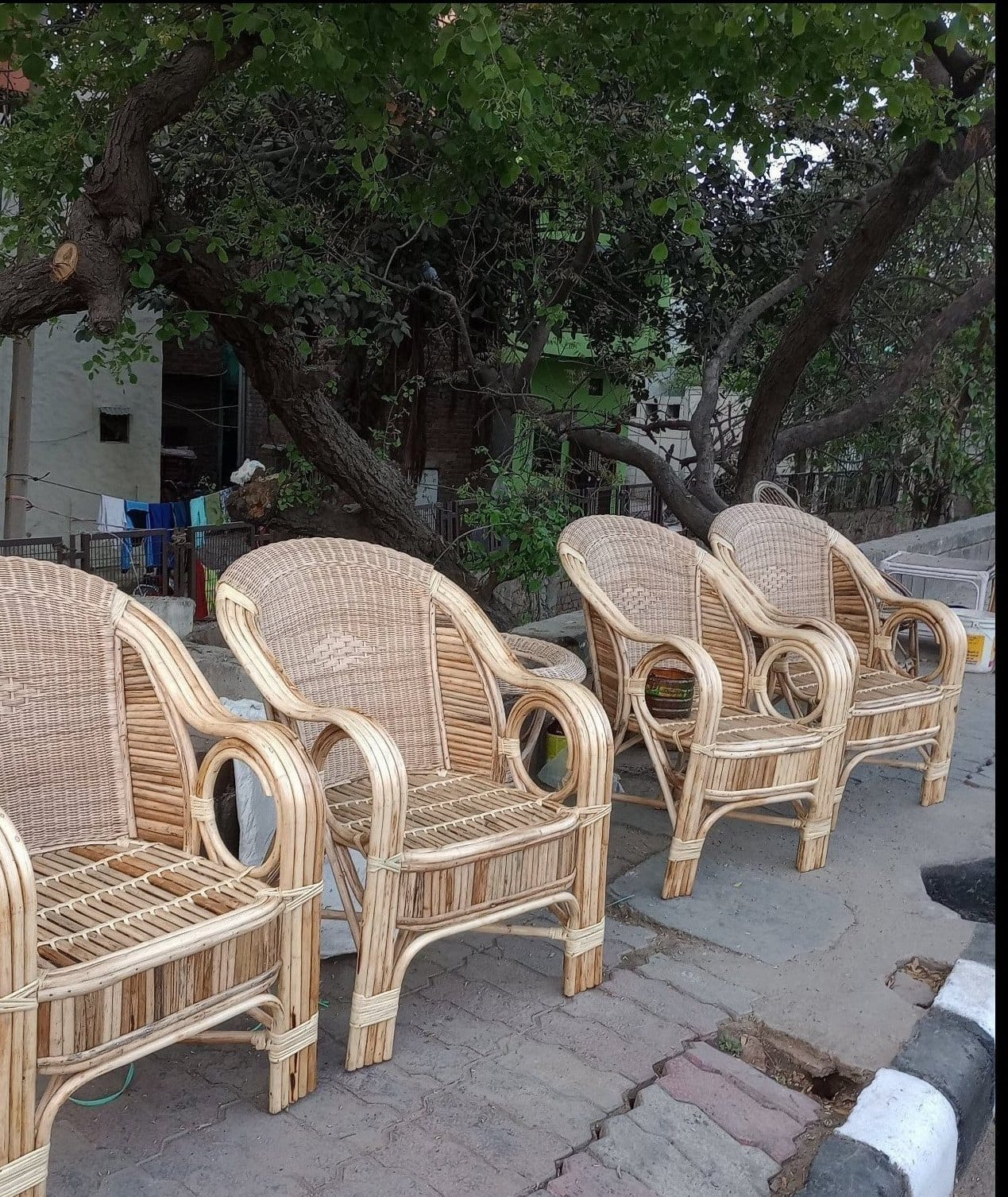 Classic rattan armchairs with curved arms and woven backrest.