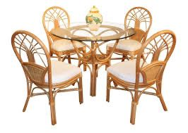 A stylish round glass-top table paired with four rattan chairs, perfect for dining spaces.