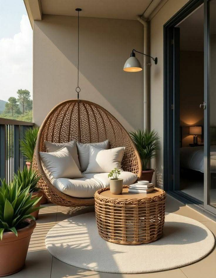 Cozy hanging rattan egg chair with thick cushions for balcony relaxation.