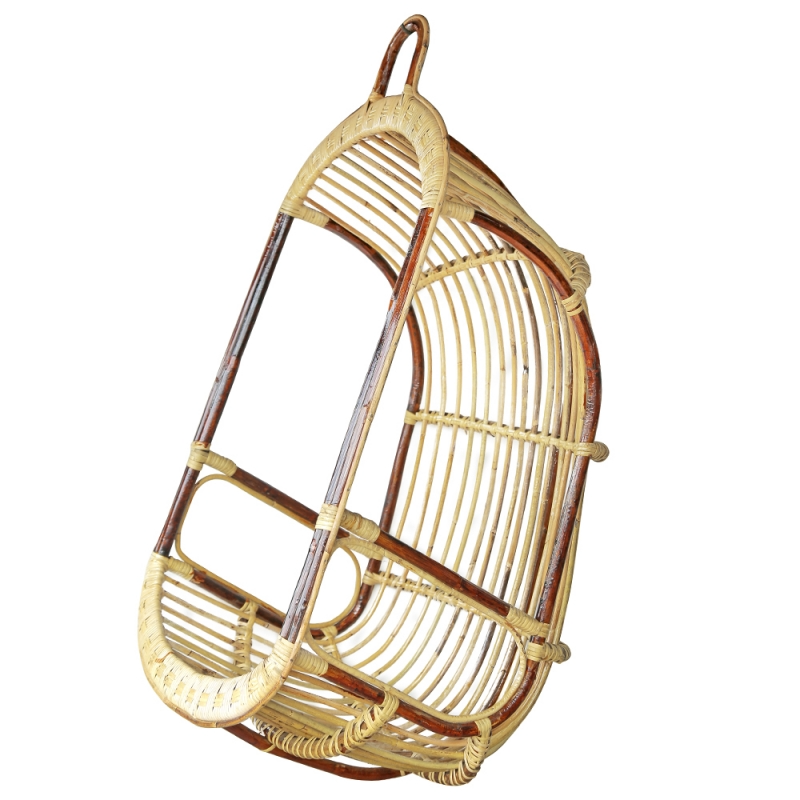 Strong handcrafted hanging rattan swing for balcony or indoor relaxation.