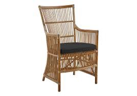 Tall, straight-back cane chair with black cushion and vertical slat design; comfortable for dining or reading.