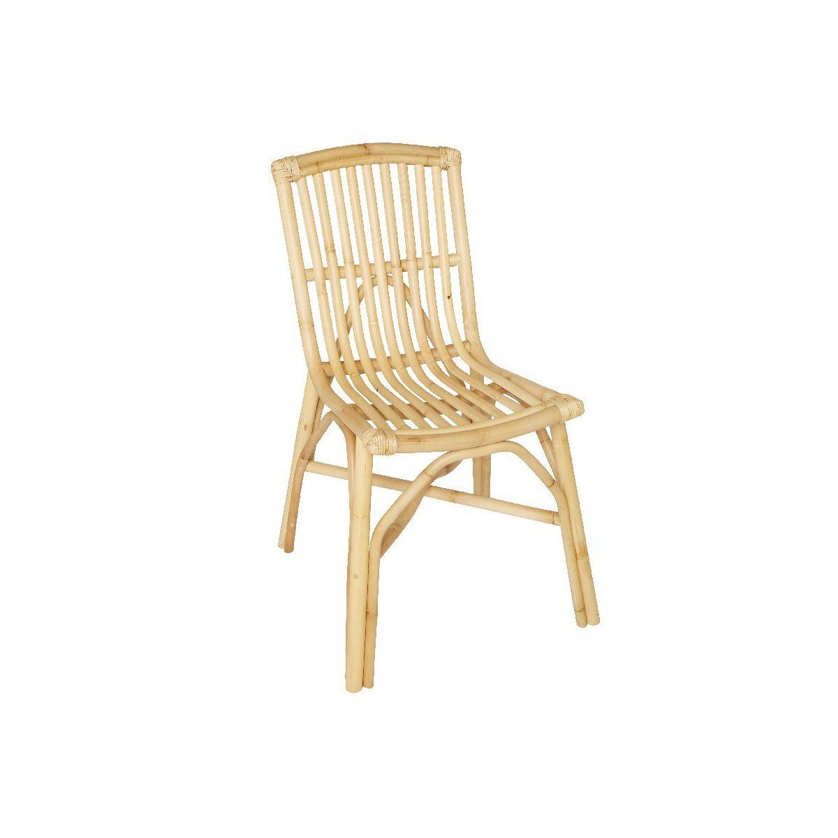 A lightweight dining chair made from natural rattan with a gently curved seat and vertical slat back.