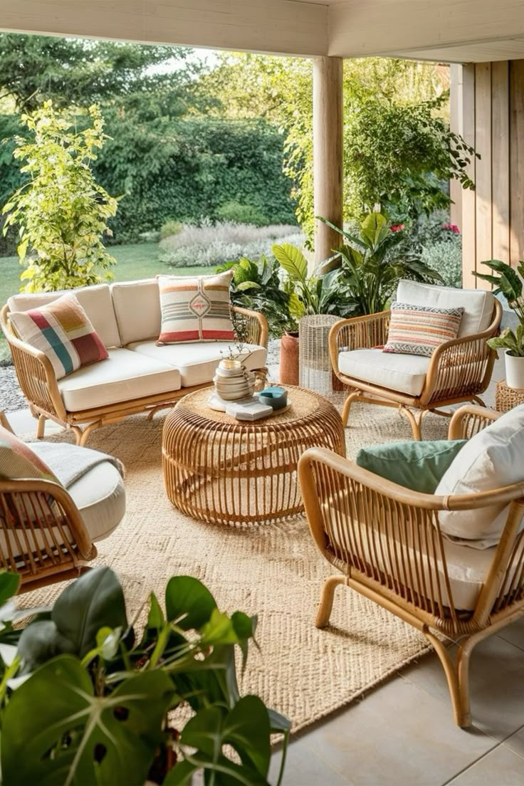 Cozy outdoor seating set with cushioned chairs and a round rattan center table—designed for garden or balcony comfort.
