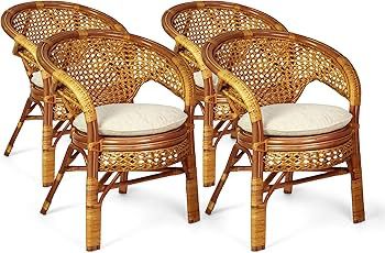A stylish set of four handcrafted rattan barrel chairs featuring a woven cane backrest and cushioned seat