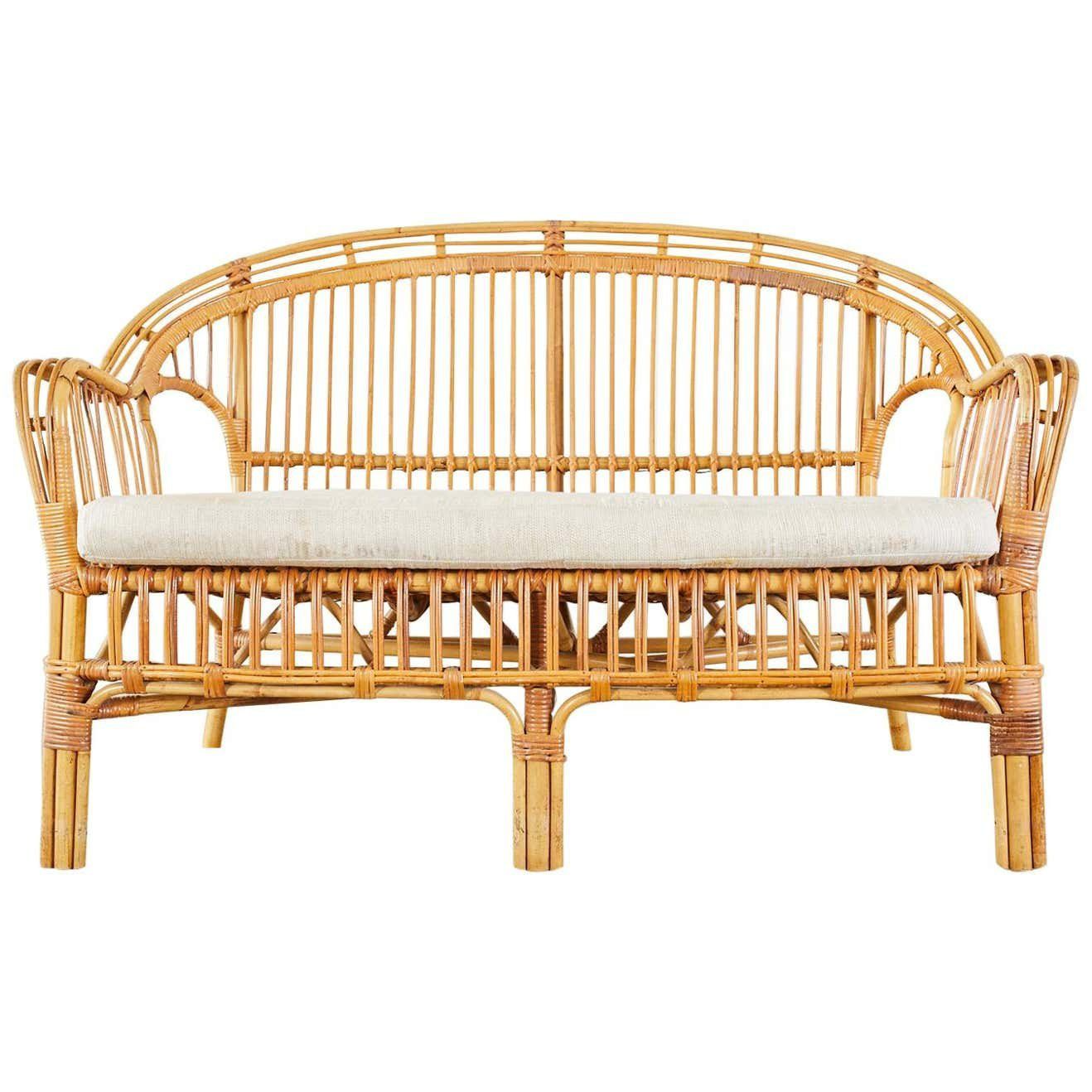 Elegant rattan sofa with tall curved back and firm cushioned seating.