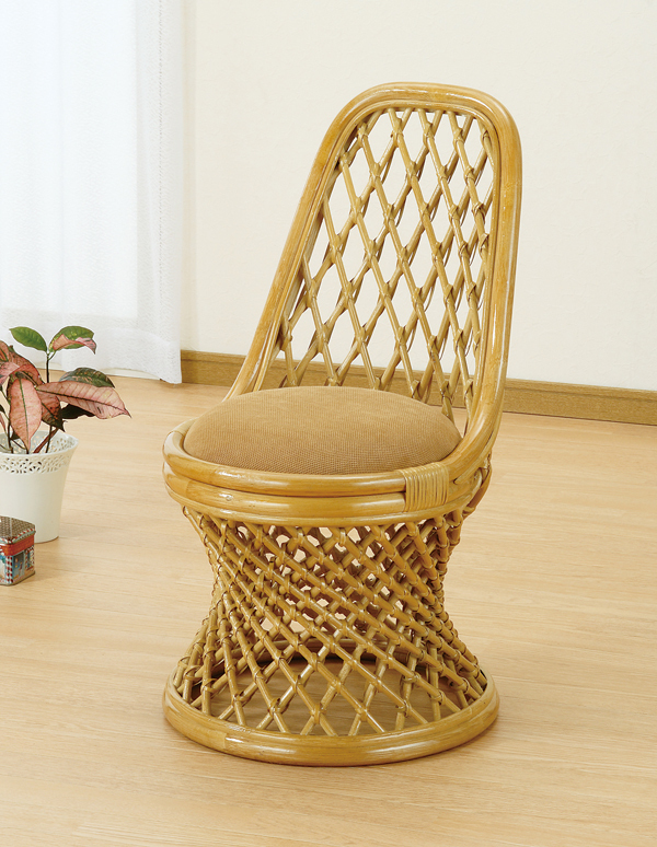 A tall woven rattan chair with a round cushioned seat.