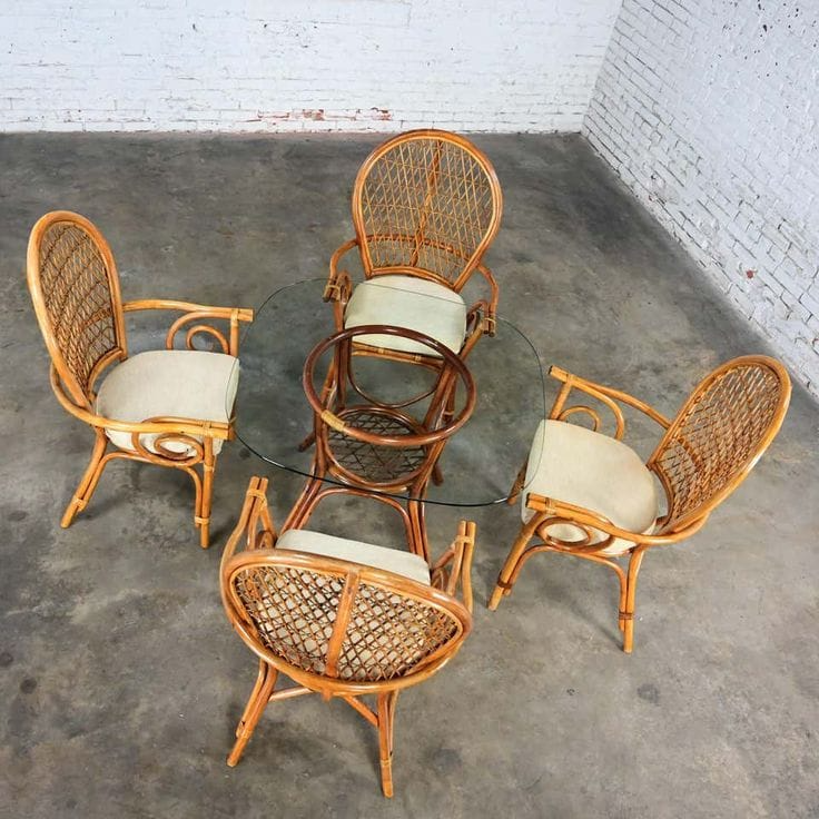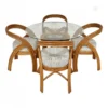 A handcrafted rattan dining table paired with four high-back cane chairs—classic, sturdy, and perfect for home cafés or dining rooms.