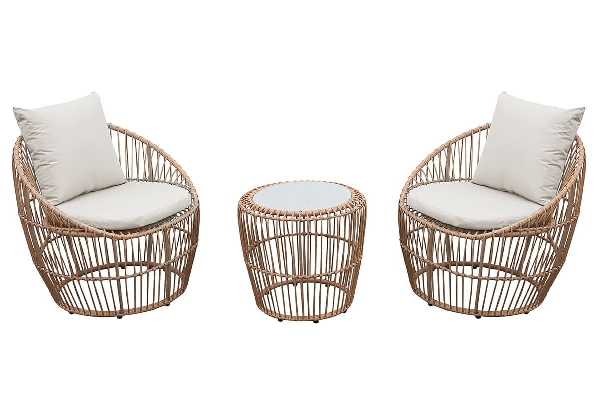 Stylish round rattan lounge chairs with a matching glass-top table for balcony or patio.