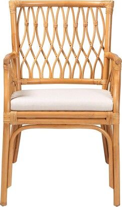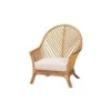 A hand-woven rattan chair featuring a vertical lattice back design and cushioned seating. Ideal for living rooms or patios.